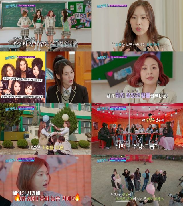 이날 베이비복스는 교복 차림으로 학교를 찾아 마치 동창회를 하는 듯 설레했다. 이어 두 남매의 엄마가 된 김이지부터, 뉴케이팝학과 교수가 된 간미연, 시나리오 작가 데뷔를 준비 중인 심은진, 배우로 활동하면서 카페를 운영 중인 이희진 등이 반전 근황을 전해 반가움을 안겼다. 잠시 후 ‘베이비폭스’(?)로 변신한 채리나, 이지혜, 이영현, 아이비, 나르샤, 초아가 “여기 누가 짱이야?”라며 강렬하게 등장, 팽팽한 기싸움을 시작했다. 이에 심은진이 당당히 앞에 나타났고, 이지혜와 나르샤는 “쫄지마!”를 외치면서도 곧장 ‘맏언니’ 채리나 뒤에 숨어 폭소를 자아냈다.