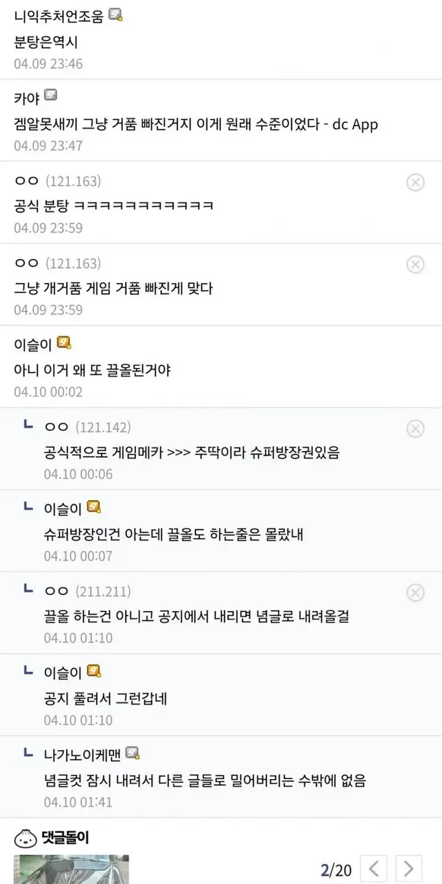 그것도 게임 망했단 글 쓰지 말라며 공지 올린 다음날에 념글 차지