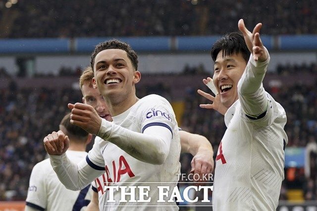 토트넘의 '캡틴' 손흥민(오른쪽)이 10일 아스톤 빌라와 EPL 28라운드 원정경기에서 1골 2도움으로 맹활약하며 4-0 대승을 이끌었다. 사진은 브레넌 존슨과 함께 골세리머니를 펼치는 손흥민./버밍엄=AP.뉴시스