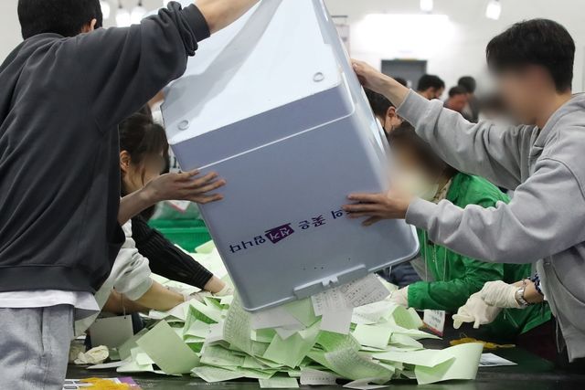 제22대 국회의원 선거가 종료된 지난 10일 개표사무원들이 투표함 열어 투표용지를 쏟아내고 있다. / 뉴스1