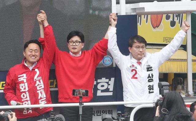 한동훈 국민의힘 총괄선거대책위원장이 제22대 국회의원선거(총선) 사전투표일인 5일 오전 인천 미추홀구 토지금고시장 앞에서 열린 ‘국민의힘으로 동미추홀살리기' 지원유세에서 심재돈 동구미추홀갑 후보와 윤상현 동구미추홀을 후보의 지지를 호소하고 있다. / 뉴스1