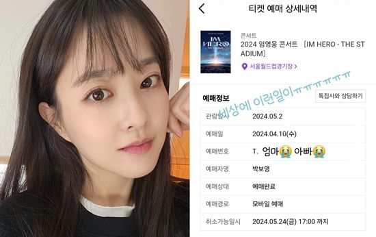 박보영은 10일 개인 계정에 "세상에 이런 일이"라는 문구와 함께 사진을 올렸다. 공개된 사진에는 임영웅의 콘서트 예매 상세내역이 담겼다.