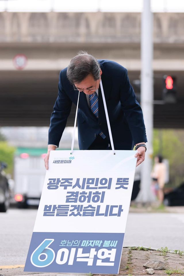 11일 오전 이 공동대표는 광주 광산구 산월교차로 등에서 낙선 인사 시간을 가졌다. 광산구을 유권자 마음을 사로잡지 못한 이 공동대표는 겸허한 마음으로 고개를 연신 숙였다. '광주 시민의 뜻 겸허히 받들겠습니다'라는 문구가 적힌 피켓을 목에 건 이 공동대표는 허리를 90도 가까이 숙이며 시민들에게 낙선 인사를 건넸다.