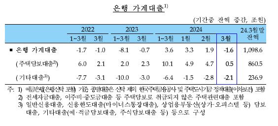 11일 한국은행이 발표한 ‘2024년 3월중 금융시장 동향’에 따르면 지난달 은행 가계대출(정책모기지론 포함) 잔액은 1098조6000억원으로 전월 대비 1조6000억원 감소했다. 작년 4월 이후부터 이어져오던 증가세가 1년 만에 꺾인 것이다. 주택담보대출이 증가폭이 크게 줄고, 기타대출이 줄어든 영향이 컸다.