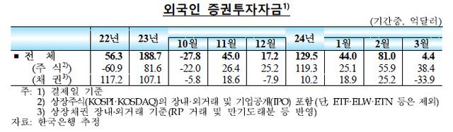11일 한국은행이 발간한 ‘2024년 3월 이후 국제금융·외환시장 동향’에 따르면 외국인들은 지난달 4억4000만달러 자금을 국내 증권에 순투자했다. 작년 11월 이후 5개월 연속 자금 유입이다.