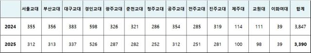 이에 따라 교육부는 이화여대 초등교육과(39명)를 제외한 12개 교대(교원대·제주대 포함)의 입학정원을 3808명에서 3351명으로 457명(12%) 줄이기로 했다. 이런 정원 감축안은 올해 치러질 2025학년도 입시부터 반영된다. 이화여대 초등교육과를 합하면 13개 대학의 입학정원은 3847명에서 3390명으로 감소된다. 사립인 이화여대의 정원감축은 대학 자율에 맡길 방침이다.