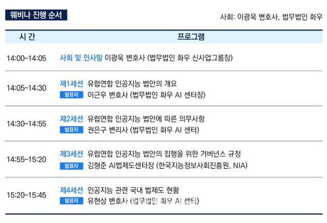 화우 AI센터는 EU 인공지능법안에 국내 인공지능 관련 종사자들이 적절히 대처할 수 있도록 해당 법안의 주요 내용과 및 국내 법제화 현황 등을 설명한다는 계획이다. 유럽연합 인공지능 법안이 통과되기까지의 과정을 추적 관찰한 화우 AI센터 전문가들이 연구 결과를 공유한다. 보다 심층적인 내용을 다루기 위해 과학기술정보통신부 산하 한국지능정보사회진흥원(NIA)도 발제에 참여한다.