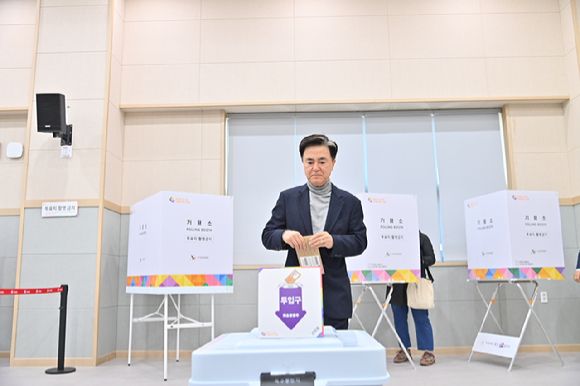 김태흠 충남지사가 지난 5일 한국농어촌공사 충남지역본부 2층 대회의실에 마련된 홍성군 홍북읍 사전투표소를 찾아 제22대 국회의원 선거 사전투표를 실시하고 있다. [사진=뉴시스 / 충남도 제공]