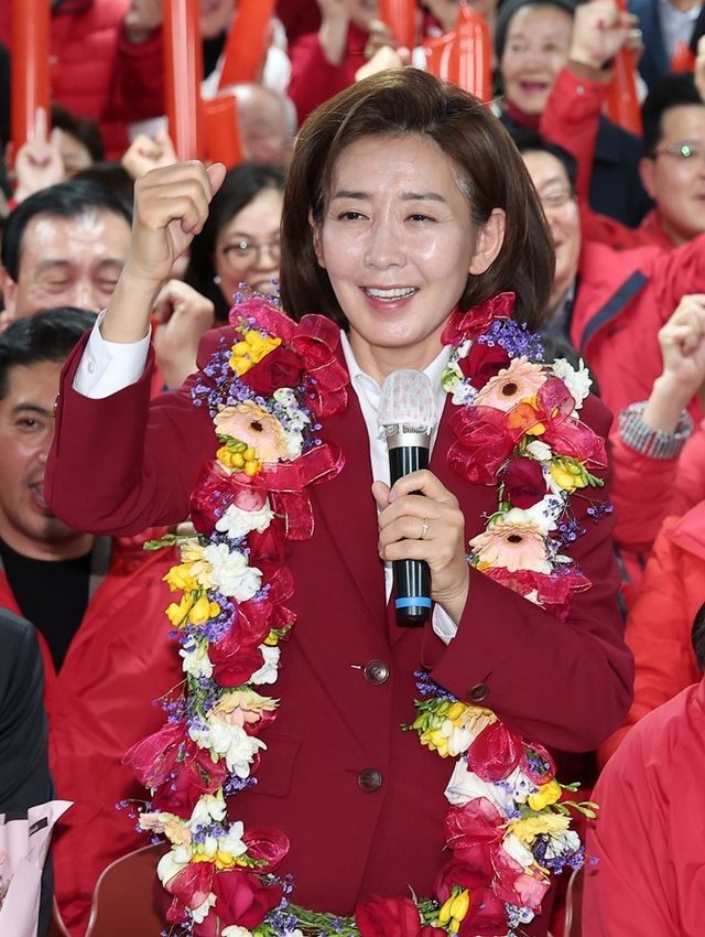나경원 국민의힘 서울 동작을 후보가 11일 서울 동작구 사당동에 마련된 선거사무소에서 당선이 확실시 되자 환호하고 있다. / 뉴스1