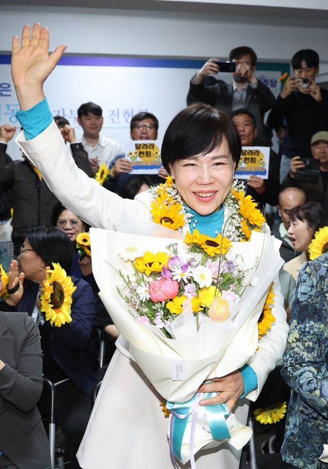 전현희 더불어민주당 서울 중·성동갑 후보가 11일 서울 성동구 왕십리로에 마련된 자신의 선거사무실에서 당선이 유력해지자 꽃다발을 전달받고 있다. / 뉴스1