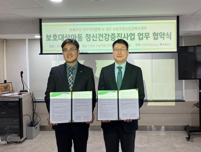 [파이낸셜경제=김영란 기자] 대구 수성구정신건강복지센터는 지난 9일 초록우산어린이재단 대구지역본부와 보호대상아동 정신건강증진사업 활성화를 위한 업무협약을 맺었다.