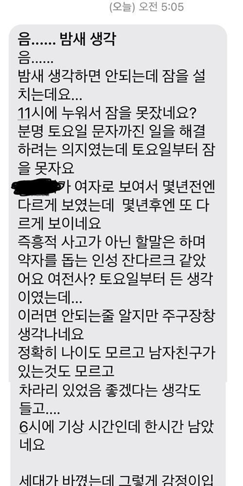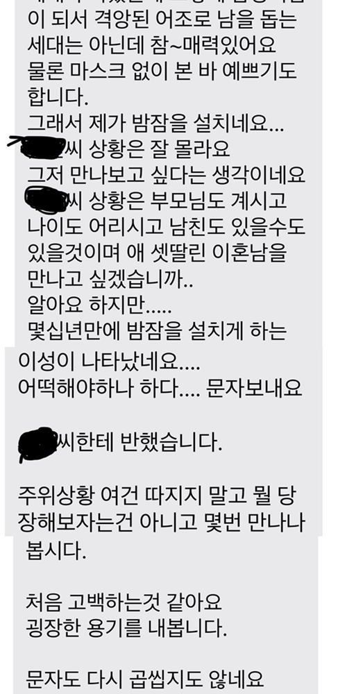 여성 A 씨는 최근 한 온라인 커뮤니티에 '새벽 5시에 나이 많은 이혼남한테 고백 문자를 받았습니다'라는 제목의 글을 올렸다.
