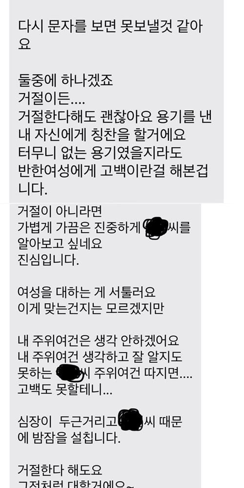 마지막으로 "주위 상황, 여건 따지지 말고 뭘 당장 해보자는 건 아니다. 몇 번 만나나 보자. 거절한다고 해도 괜찮다. 용기 낸 나 자신을 칭찬할 거다. 거절이 아니라면 가볍게 가끔은 진중하게 A 씨를 알아보고 싶다. 거절해도 그전처럼 대하겠다. 더 친해질 수 있을 거다. 마음 어지럽게 해서 미안하다"고 덧붙였다.