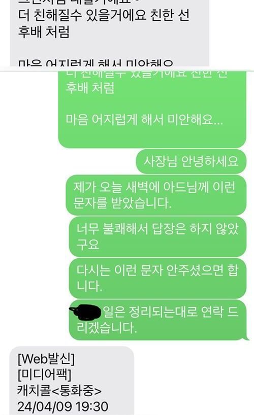 A 씨는 "날 얼마나 우습게 봤으면 이런 문자를 보냈을까. 나이는 몇 살인지 모르지만 저보다 훨씬 많다. 중년의 아저씨다. 너무 불쾌하다"며 남성이 보낸 문자 내용을 공개했다.