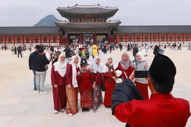 正在景福宫前拍照的外国游客。【图片提供 韩联社】