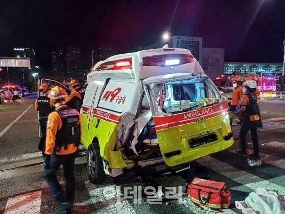 A씨의 구급차 추돌로 이송 중이던 B씨(70대)가 다치고 보호자인 B씨의 아내는 숨졌다. 구급대원 3명도 골절 등 상처를 입었다.