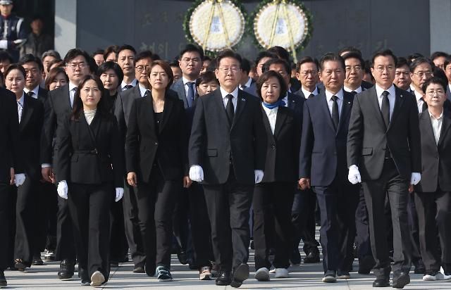12日,韩国最大在野党共同民主党代表李在明携刚刚在国会选举中当选的议员们参拜国立首尔显忠院。