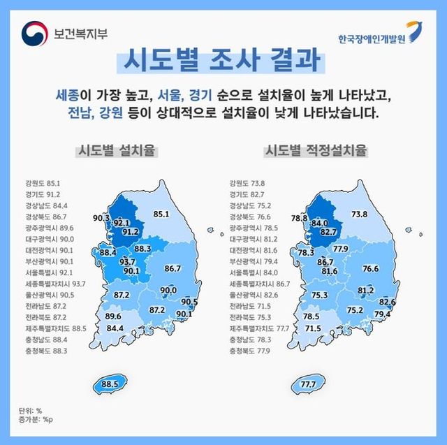 보건복지부장애인 편의시설 설치율 89.2%로 ‘18년보다 9.0%p 상승, 세종·서울·경기 등 높아