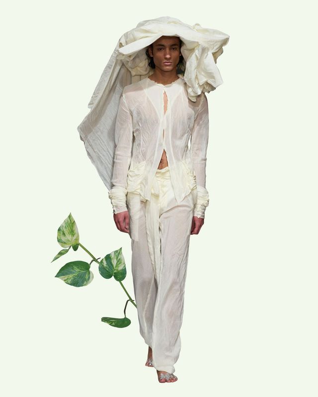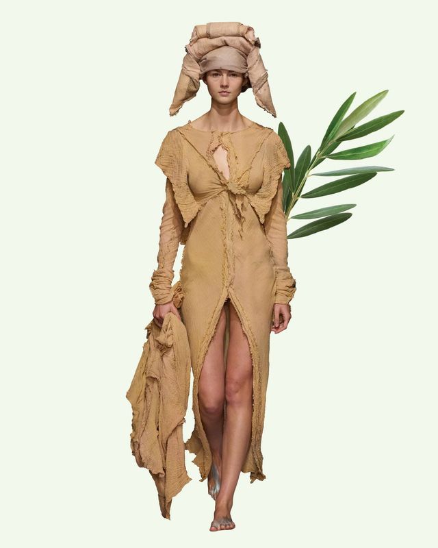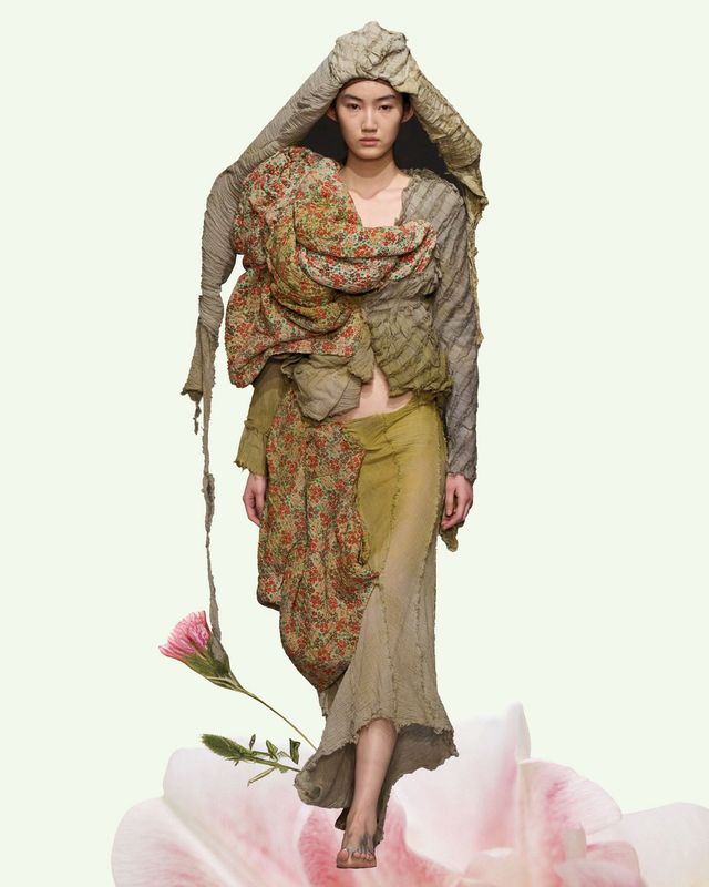 영국 웨일스 출신 디자이너 파올로 카자나는 포토벨로 마켓과 오가닉 숍에서 재료를 찾는다. 그곳에서 구한 채소와 꽃, 향료로 재활용 천과 오가닉 소재를 염색해 자연적인 색감을 덧입힌다. 디자인 역시 드레이핑 등 수작업을 활용한 공예적 디테일로 가득하다. 밑단을 재봉하지 않은 거친 질감의 천을 켜켜이 덧대고 비정형적 형태감으로 완성한 룩은 한 떨기 꽃 같다.