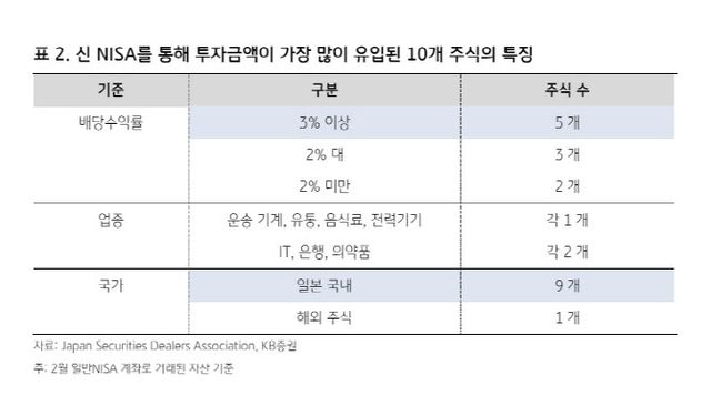 그는 “투자 자산에 있어서도, 해외 자산에 대부분 투자 금액이 몰렸던 과거와 달리 올해 1~2월 NISA 투자 금액 중 약 91%가 일본 주식 및 ETF, 리츠로 집중됐다”며 “자금이 가장 많이 유입된 개별 주식 기준으로도 일본 국내주식 및 고배당 종목이 대부분을 차지한다”고 덧붙였다.