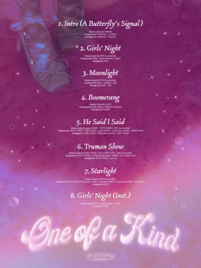 트랙리스트에 따르면 ‘원 오브 어 카인드’에는 다채로운 색을 머금은 8트랙이 담긴다. 인트로 ‘어 버터플라이스 시그널‘(A Butterfly’s Signal)로 문을 열고 타이틀곡 ‘걸스 나잇’(걸스 나잇)을 지나 ‘문라이트’(Moonlight), ‘부메랑’, ‘히 세이드 아이 세이드’(He Said I Said), ‘트루먼 쇼’(Truman Show), ‘스타라이트’(Starlight) 등이 수록됐다.