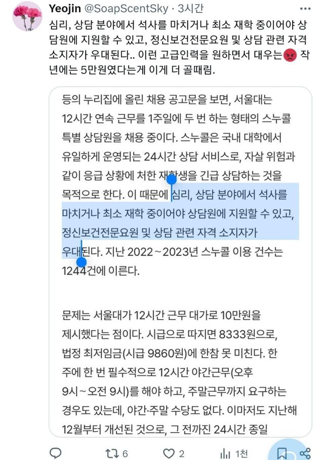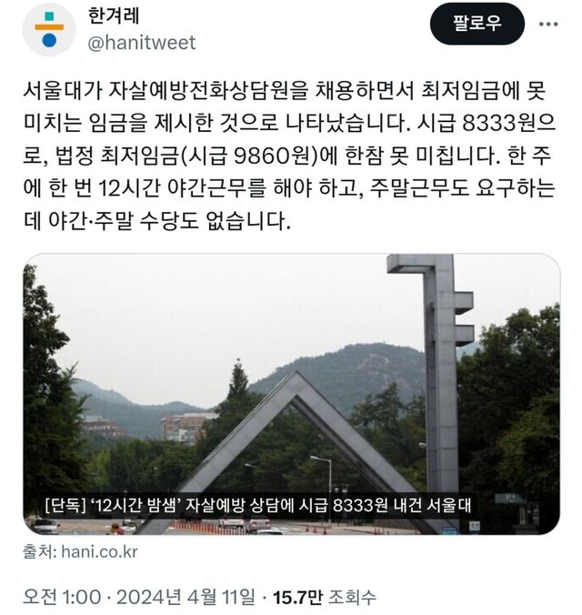 서울대측은 처우가 열악하다는 알고 있다면서도 상담 전화가 항상 오는게 아니라고