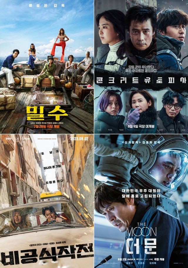 [스포츠조선 조지영 기자] 2023년 여름, 극장가 완벽한 승자는 없었다. 1000만 영화 탄생의 성지였던 여름 극장가의 명성이 무색하게 올해는 손익분기점을 넘은 한 편의 작품을 제외하고 세 편의 작품이 아쉬운 성적을 남기면서 충무로 위기를 몸소 체험했다. 12일 영화진흥위원회가 공개한 2023년 8월 한국 영화산업 결산 발표에 따르면 8월 전체 매출액은 1433억원으로 전년 동월 대비 5.9%(90억원) 감소했고, 8월 전체 관객 수는 1456만명으로 전년 동월 대비 2.6%(39만명) 줄었다. 여름 성수기 개봉한 한국 대작 영화들이 기대 이하의 성적을 거두면서 8월 전체 매출액은 코로나 19 팬데믹 이전인 2017~2019년 8 월 전체 매출액 평균(2318억원)의 61.8% 수준을 기록했고, 8월 전체 관객 수는 2017~2019 년 8월 전체 관객 수 평균(2831만명)의 51.4% 수준을 기록한 데 그쳤다. 무엇보다 코로나19 팬데믹 여파로 8월 시장 규모가 줄어들고 한국 텐트폴 영화 4편이 여름 성수기로 몰려 과열 경쟁이 벌어진 탓에 한국 영화는 여름 성수기에 걸맞은 흥행작을 내놓지 못했다고 분석했다. 8월 한국 영화 매출액은 코로나19 팬데믹 이전 평균 매출액의 절반을 겨우 넘겼고, 8월 한국 영화 관객 수는 팬데믹 이전 평균의 절반에도 미치지 못했다. 8월 한국 영화 매출액은 910억원으로 2017~2019년 8월 한국 영화 매출액 평균(1687억원)의 53.9% 수준이었고, 전년 동월 대비로는 26.3%(324억원 ) 감소했다. 8월 한국 영화 관객 수는 939만명으로 2017~2019년 8월 한국 영화 관객 수 평균(2052만명)의 45.8% 수준, 전년 동월 대비로는 22.7%(275만명) 줄었다. 8월 한국 영화 매출액 점유율은 63.5%였고, 한국 영화 관객 수 점유율은 64.5%로 아쉬움을 남겼다. 8월 매출만 따졌을 때 ‘콘크리트 유토피아'(엄태화 감독)가 매출액 337억원(관객수 345만명)으로 8월 전체 흥행 1위를 차지했다. 7월 흥행작이었던 ‘밀수'(류승완 감독)가 매출액 294억원(관객수 304만명)으로 8월 흥행 2위를 차지했다. 올해 여름 텐트폴 영화 중 가장 먼저인 지난 7월 26일 관객을 찾은 ‘밀수’는 7월과 8월 합산 매출액 485억원(관객 수 502만명)을 기록하며 올여름 최고 흥행작으로 자존심을 지켰다. 여름 대목인 8월 첫 주에 동시 개봉한 ‘비공식작전'(김성훈 감독)과 ‘더 문'(김용화 감독)의 경우, 각각 매출액 98억원(관객수 101만명), 매출액 49억원(관객수 48만명)으로 8월 매출 기준 100억원을 넘기지 못했다. ‘비공식작전’과 ‘더 문’은 8월 전체 흥행 5위와 7위를 기록했다.