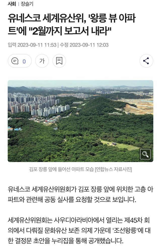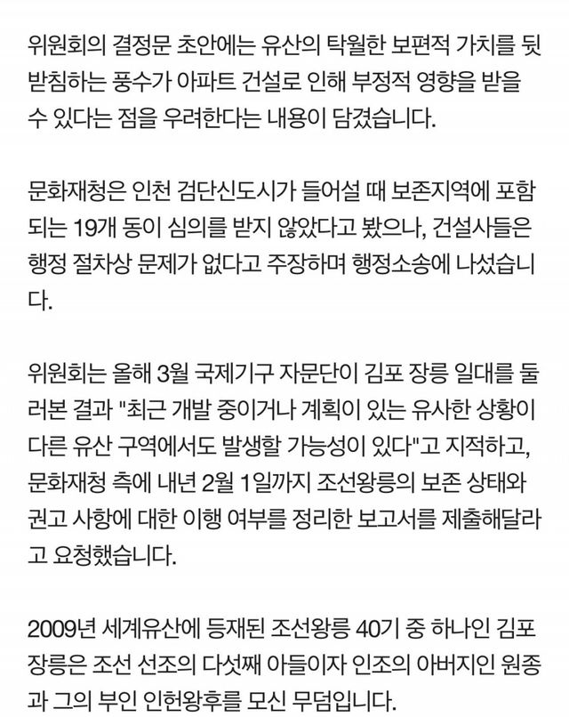 유네스코 자문단이 올해 3월 직접 장릉 일대를 둘러보고 아파트 건설로 인해 왕릉 풍수가 부정적인 영향을 받을 수 있다고 우려하는 결정문을 공개함.