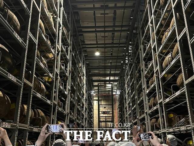 이날 설명을 맡은 이영규 증류주 제조 파트장은 "목통 숙성실은 증류식 소주의 원료가 되는 증류원액을 저장하는 곳으로 목통에서 숙성과정을 거친다"며 "시간이 지나면서 나무 안에 있는 셀룰로오스와 반응하게 되면 흔히 아는 위스키 같은 술이 된다"고 말했다.