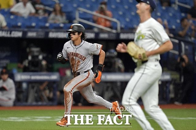 '바람의 손자' 이정후가 15일 15일 탬파베이와 2024 MLB 인터리그에서 샌프란시스코의 1번타자로 나서 1회 초 안타와 도루에 이어 득점까지 하고 있다./세인트 피터즈버그(미 플로리다주)=AP뉴시스