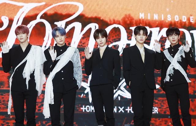 1日,韩国男团TXT在高丽大学举行的迷你6辑《minisode 3: TOMORROW》发行表演秀上向粉丝打招呼。【图片提供 韩联社】
