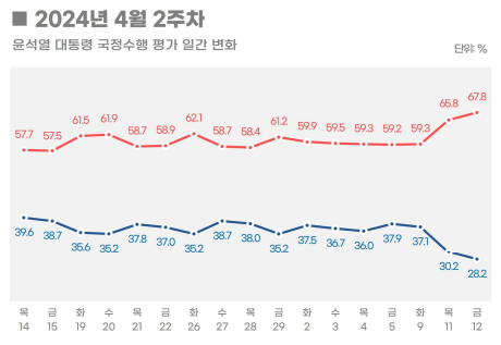 특히 지난 12일 일간 지표는 28.2%로, 취임 후 기존 최저치(28.7%)를 경신했다. 여권 총선 패배 이후 용산 책임론이 불거지며 국정 운영 차질이 예상되자 주간 후반에 급락세를 보인 것으로 풀이된다.