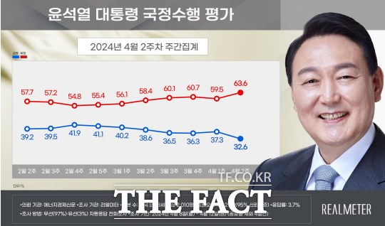 리얼미터가 15일 발표한 여론조사(에너지경제신문 의뢰, 4월 8∼12일 전국 18세 이상 유권자 2010명 대상, 조사(95% 신뢰수준에 오차범위 ±2.2%포인트) 결과, 윤 대통령의 국정수행 긍정평가는 직전 조사보다 4.7%포인트 하락한 32.6%로 집계됐다. 동일 기관 기준 지난해 10월 3주차(32.5%) 이후 가장 낮은 수치다. 부정평가는 4.1%포인트 오른 63.6%였다.