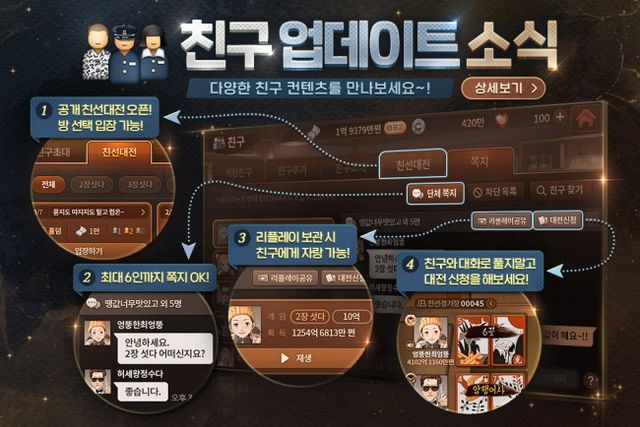 '공개형 친선대전'의 활성화를 위해 추천 친구와 친구 검색을 통해 게임 친구를 등록할 수 있는 '친구 등록' 기능과 1:1및 단체 대화를 지원하는 '쪽지', 나만의 부캐를 만들 수 있는 '프로필 설정' 등의 커뮤니티 기능도 함께 강화했다.