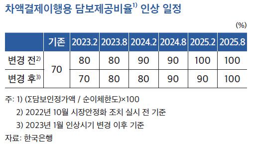 현재 차액결제담보 비율은 80%이다. 작년 8월 70%에서 10%포인트 인상됐다. 한은은 이 비율을 오는 8월에 90%, 내년 8월 100%로 인상할 계획이다. 글로벌 금융위기 이후 국제기준(PEMI)에서 지급결제시스템의 신용리스크를 완전히 없애는 수준의 담보를 확보하도록 권고하고 있기 때문이다.
