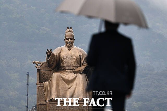 [더팩트ㅣ박헌우 기자] 전국에 비가 예보된 15일 오전 서울 종로구 광화문 광장 인근의 관광객이 우산을 쓴 채 발걸음을 재촉하고 있다.