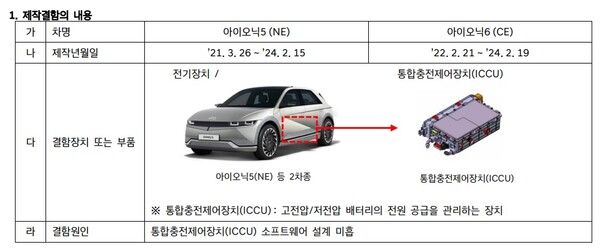 국토교통부(국토부)는 현대차가 제작 판매한 아이오닉5 2021년 3월 26일~2024년 2월 19일 사이 생산분 1370대에서 통합충전제어장치(ICCU)의 제작결함이 발견됐다고 말했다.