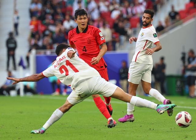 2024년 1월 20일(현지 시각) 카타르 도하 앗수마마 스타디움에서 열린 2023 아시아축구연맹(AFC) 카타르 아시안컵 조별리그 E조 2차전 요르단과 한국의 경기에서 김민재가 요르단 니자르 알라시단의 수비를 피해 전방 스루패스를 찔러주고 있다. / 연합뉴스
