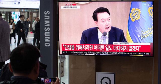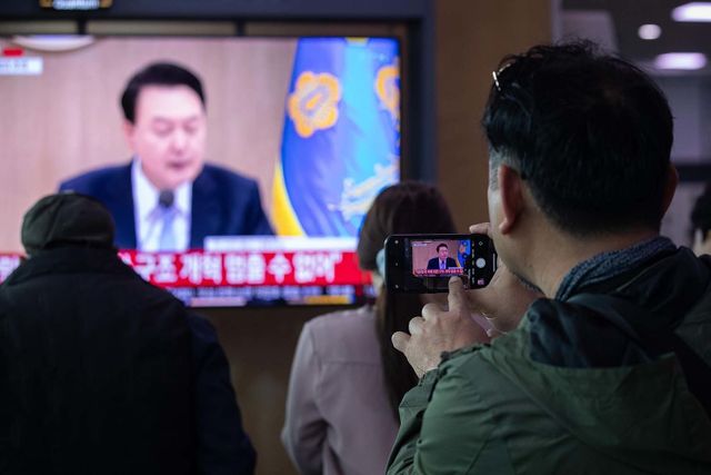 16일 서울역에서 한 시민이 윤석열 대통령 주재 국무회의 생중계를 휴대전화 카메라로 촬영하고 있다. 윤 대통령은 이날 용산 대통령실에서 열린 국무회의에서 "어려운 국민을 돕고 민생을 챙기는 것이 정부의 존재 이유"라며 "그런 측면에서 이번 총선을 통해 나타난 민심을 우리 모두 겸허하게 받아들여야 한다"고 밝혔다. / 뉴스1