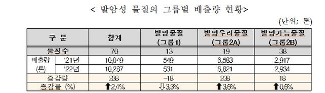 국제암연구기관(IARC)의 기준에 따라 발암성 물질을 그룹별로 보면 발암성 물질을 13종이 포함된 발암물질(그룹1)의 배출량은 531톤으로 전년 549톤 대비 18톤(3%) 감소했다. 그러나 발암우려물질(그룹2A, 19종)과 발암가능물질(그룹2B, 38종)은 각각 전년 대비 238톤(3.6%), 18톤(0.6%) 증가한 것으로 나타났다.