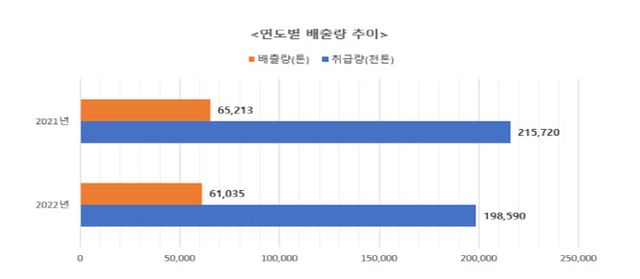 지난 2022년 배출량은 전년인 2021년 배출량 대비 4177톤(6.4%) 감소한 것이다. 고무 및 플라스틱 제조업(1.7톤 감소), 종이(펄프) 및 종이제품 제조업(1.2톤 감소), 의료용 물질 및 의약품 제조업(1톤 감소) 순으로 감소 폭이 큰 것으로 나타났다.