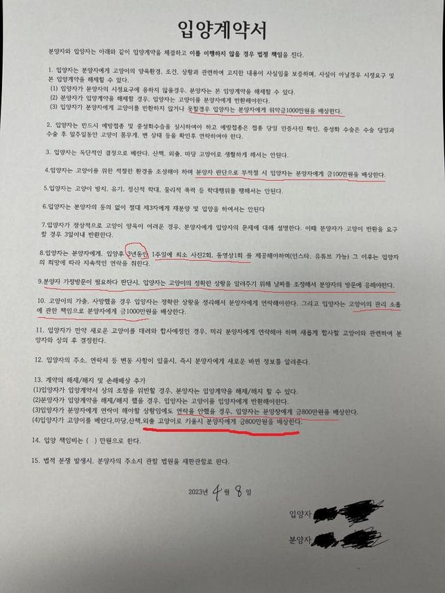 1. 고양이 반환 못할시-> 1000만원