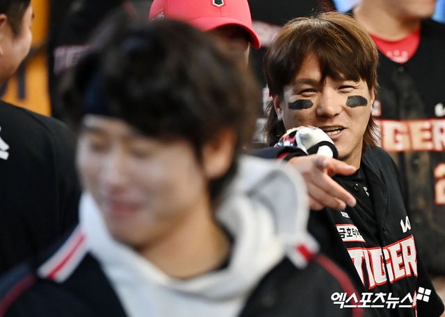 격한 축하에는 반드시 범인이 있는 법, 뒤늦게 웃으며 뒤돌아가는 박찬호를 향해 손가락질을 한 김선빈은 두고보자는 반응을 보였지만 얼굴에는 미소가 가득했다.
