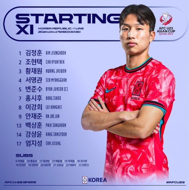 황선홍 감독이 지휘하는 대한민국 축구 올림픽 국가대표팀은 17일 오전 0시 30분(한국시간) 카타르 도하에 위치한 압둘라 빈 칼리파 스타디움에서 열린 2024 아시아축구연맹(AFC) 23세 이하(U-23) 아시안컵 겸 2024 파리 올림픽 아시아 최종 예선 B조 1차전에서 아랍에미리트(UAE)에 1-0 승리를 거뒀다.