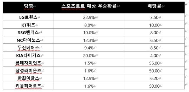 스포츠토토, ‘KBO 스페셜 기록식 26회차 X게임’ 구매 건수 206만건 넘겨…우승 확률 가장 높은 팀은 LG트윈스, 다득표 팀은 한화이글스 유지