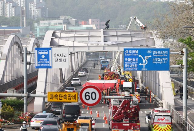 경찰과 소방은 교량 밑에 에어 매트를 설치하고 A씨가 아래로 내려오도록 설득했고, 그는 5시간 뒤인 오전 10시 52분께 크레인을 타고 내려왔다.