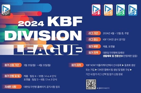 지난 2020년 시작돼 올해로 5년째인 KBF디비전 리그는 올해의 경우 캐롬D2(전문선수)리그가 시범 도입되고, 지난해 시범 종목이었던 포켓 D3리그가 정식 리그로 치러진다.