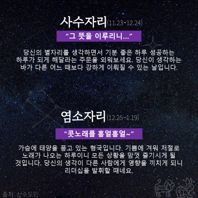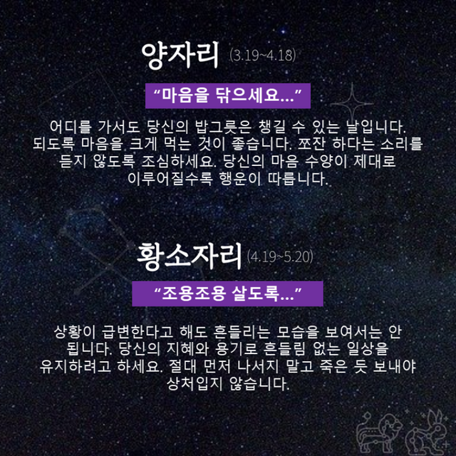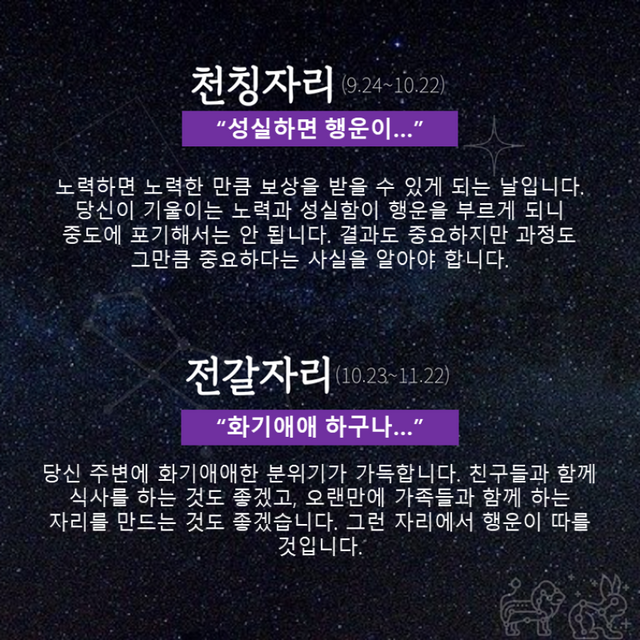 당신의 별자리를 생각하면서 기분 좋은 하루 성공하는 하루가 되게 해달라는 주문을 외워보세요. 당신이 생각하는 바가 다른 어느 때보다 강하게 이뤄질 수 있는 날입니다.