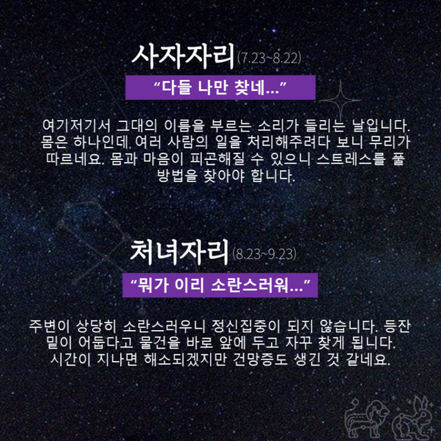 주머니 사정도 매우 좋은 편입니다. 하는 일에서 금전적 성과가 높으니 주위 사람의 부러움을 사게 될 것입니다. 사자자리 사람과 함께 일을 할 때 행운이 따르니 참고하세요.