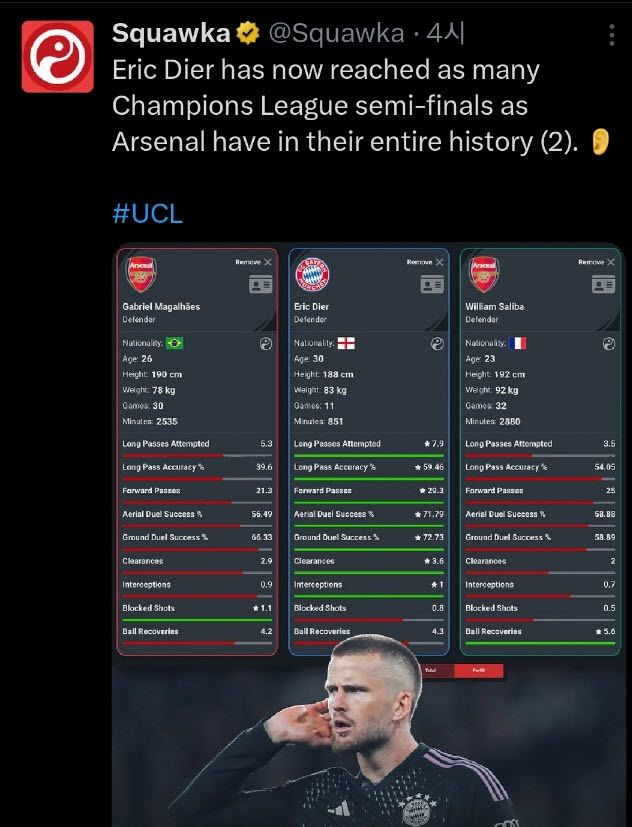 클리어링도 경기당 3.6회로 마갈량이스 2.9회, 살리바 2회를 능가한다. 경기당 가로채기는 1회다. 아스널 두 수비수는 경기당 1회가 안 된다. 물론 경기 수 차이가 있지만 스쿼카는 다이어가 아스널 두 수비수의 챔피언스리그 4강 꿈을 눌렀다고 했다.